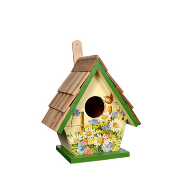 Beautifuly designed bird house with teak roof. Hand-painted in bright colors with Green meadows and daisies and a bird on the fence, adorn the front of the bird house. It will add charm and colour to your garden. • Can be hung from a porch, patio or trees. • A functional addition to your garden and a great gift· • Bird house comes with a door on the back to clean the bird house. Made in solid wood * Comes with a poly urethane coating giving it water resistant smooth finish. * Comes with hook in the back to hang.