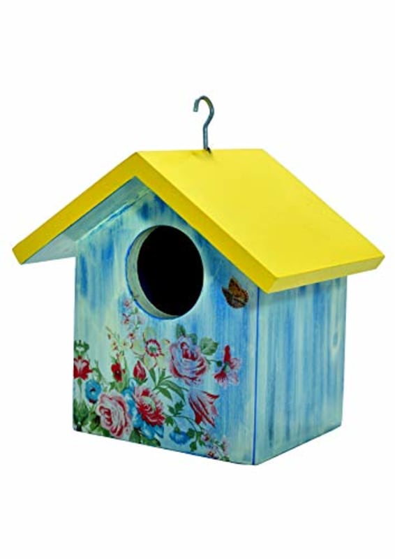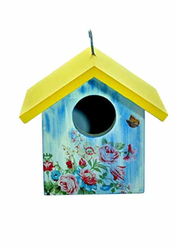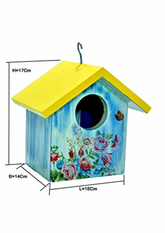 Details: Beautifully designed bird house with colorful flower adorning the roof of the bird house. It will add charm and color to your garden. Can be hung from a porch, patio or trees. A functional addition to your garden and a great gift· Bird house comes with a door at the back to clean the bird house. Made in wood * Comes with a poly urethane coating giving it water resistant smooth finish. * Comes with hook to hang.